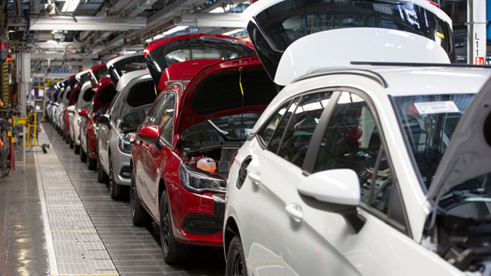 A line of cars on a car assembly line at the Vauxhall car factory in Ellesmere Port, Wirral, UK