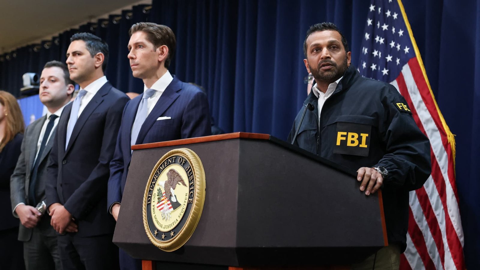 FBI Director Kash Patel (right) leads a news conference to announce arrests linked to illegal sports betting and poker schemes, in New York City on October 23, 2025.