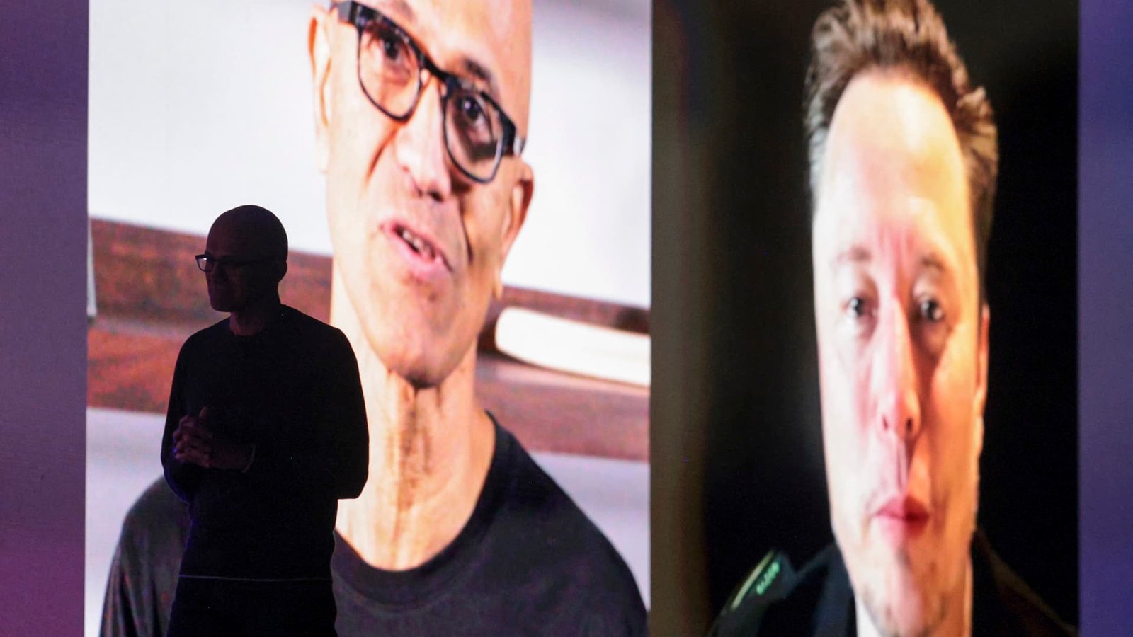 The Chairman of the Microsoft Board and CEO of Satya Nadella (L) is run as an interview in advance with Elon Musk at the Microsoft Build Conference in Seattle, Washington, on May 19, 2025.