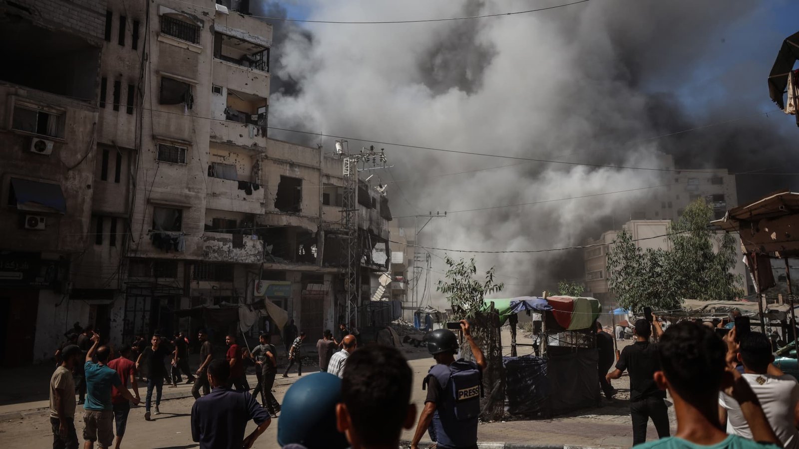 The Palestinians are watching while the Ghafri Tower collapses amid severe smoke during an Israeli strike in the Rimal neighborhood in Gaza City, on September 15, 2025.