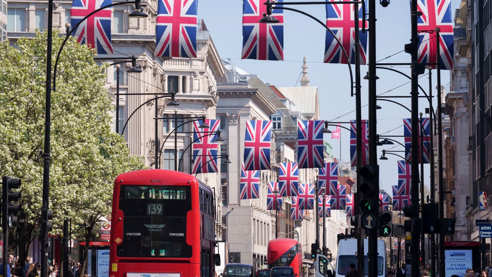 Shoppers on Oxford Street spend under the flags of Union Jack in West End, London, on April 3.